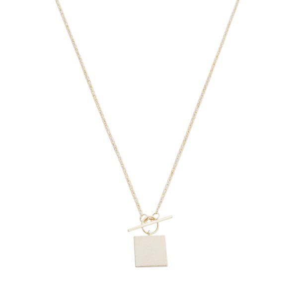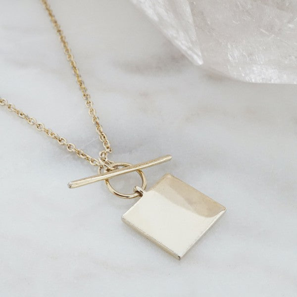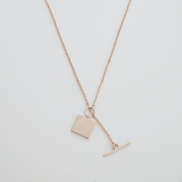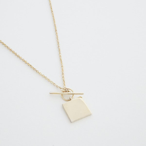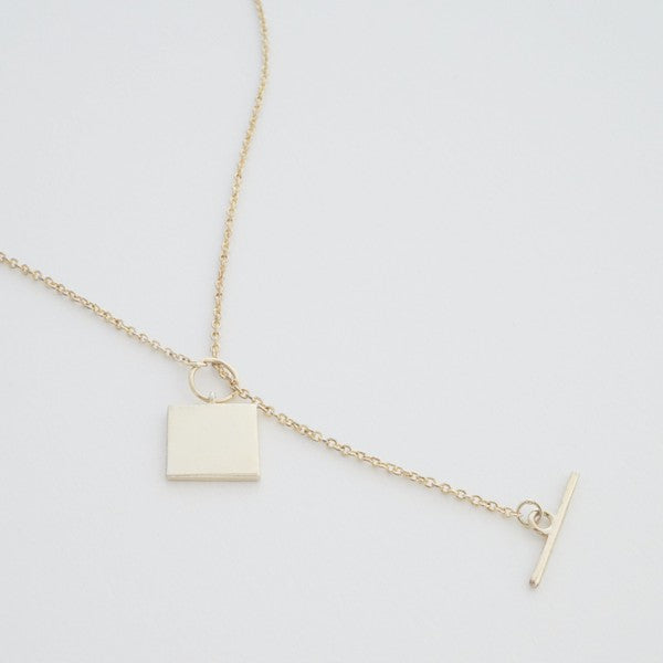 A whisper thin chained necklace featuring a polished toggle and square charm. We love wearing this one by itself as much as we do layered with another of our simple HONEYCAT chain necklaces.