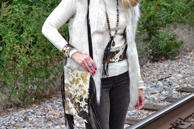 This Hair-on-Hide cuff is the perfect accessory to add a touch of glamour to any outfit. Made with genuine leather and hair-on hide, this cuff bracelet is both stylish and versatile. The adjustable cuff allows for a comfortable fit, while the gold accents add a touch of elegance. Whether you're dressing up for a night out or keeping it casual, this cuff is sure to catch the eye of your friends and leave them asking where you got it from.