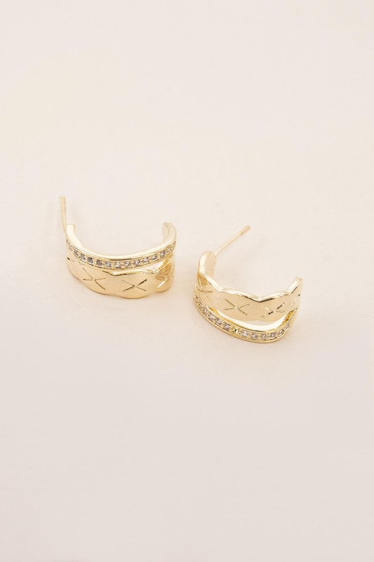 Gold hoop earrings with two layers, on with pave and one with a tufted pattern.