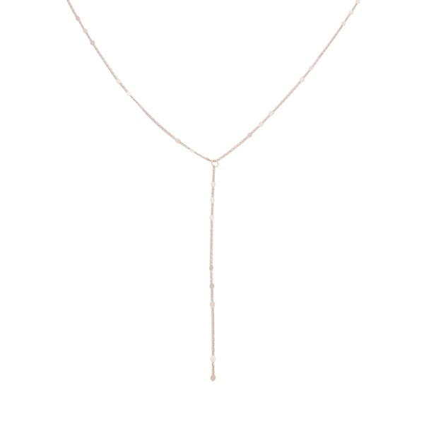 A lariat featuring a whisper thin chain spotted with tiny discs. This delicate necklace lends the perfect amount of shimmer against your neck. This delicate piece is gorgeous worn solo as it is layered alongside your favorite chains and necklaces.