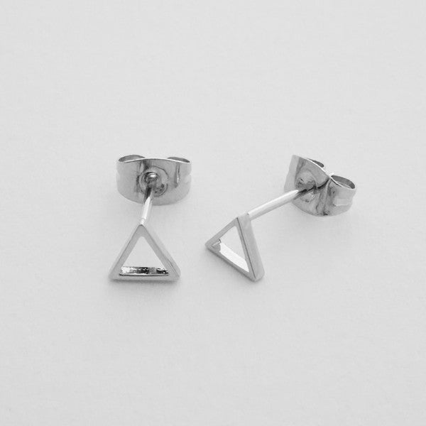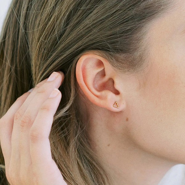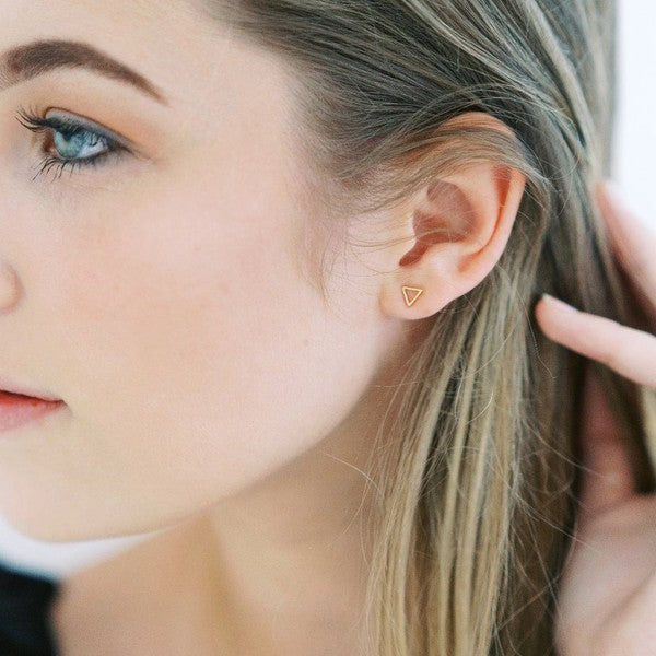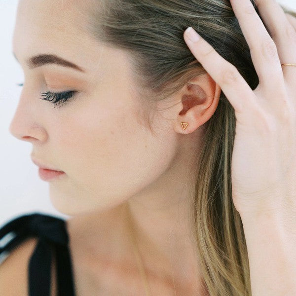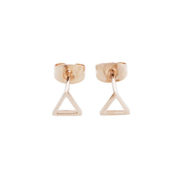 Miniature, triangle outlined stud earrings. Butterfly closure. 5.5 x 5.5 mm. Our materials make for an amazing, high quality, seamless, jewelry piece with longevity. Items are brass plated with 18k gold, 18k rose gold, or rhodium and finished with a protective coating. A little secret we'll keep between us: it looks way more than it costs.
