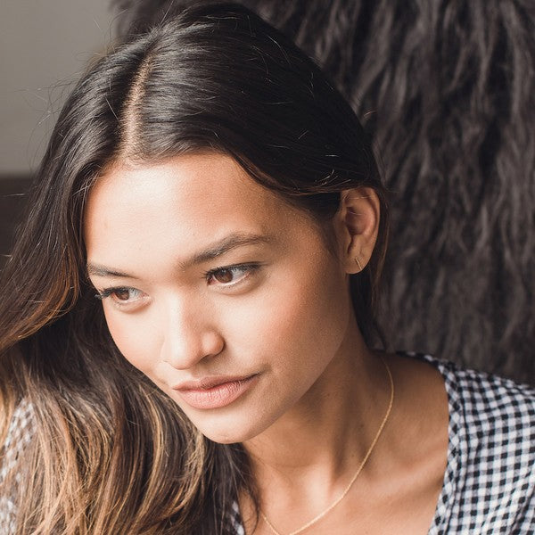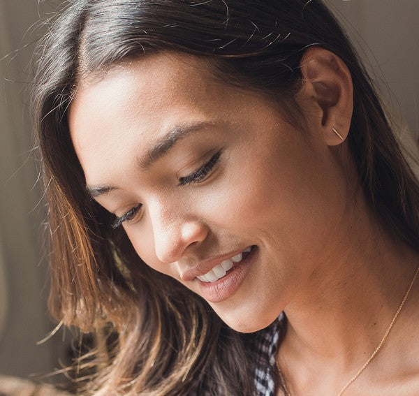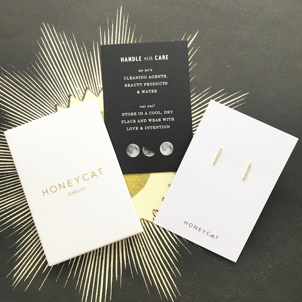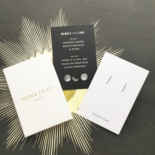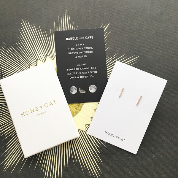 Minimalist, center stud back, skinny bar earrings adorned with a tiny row of crystals. A gorgeous, minimalist jewelry piece you can wear everyday. These are the crystal version of our loved Skinny Midi Bar Earrings. 10 mm. AAA-rated cubic zirconia crystals.